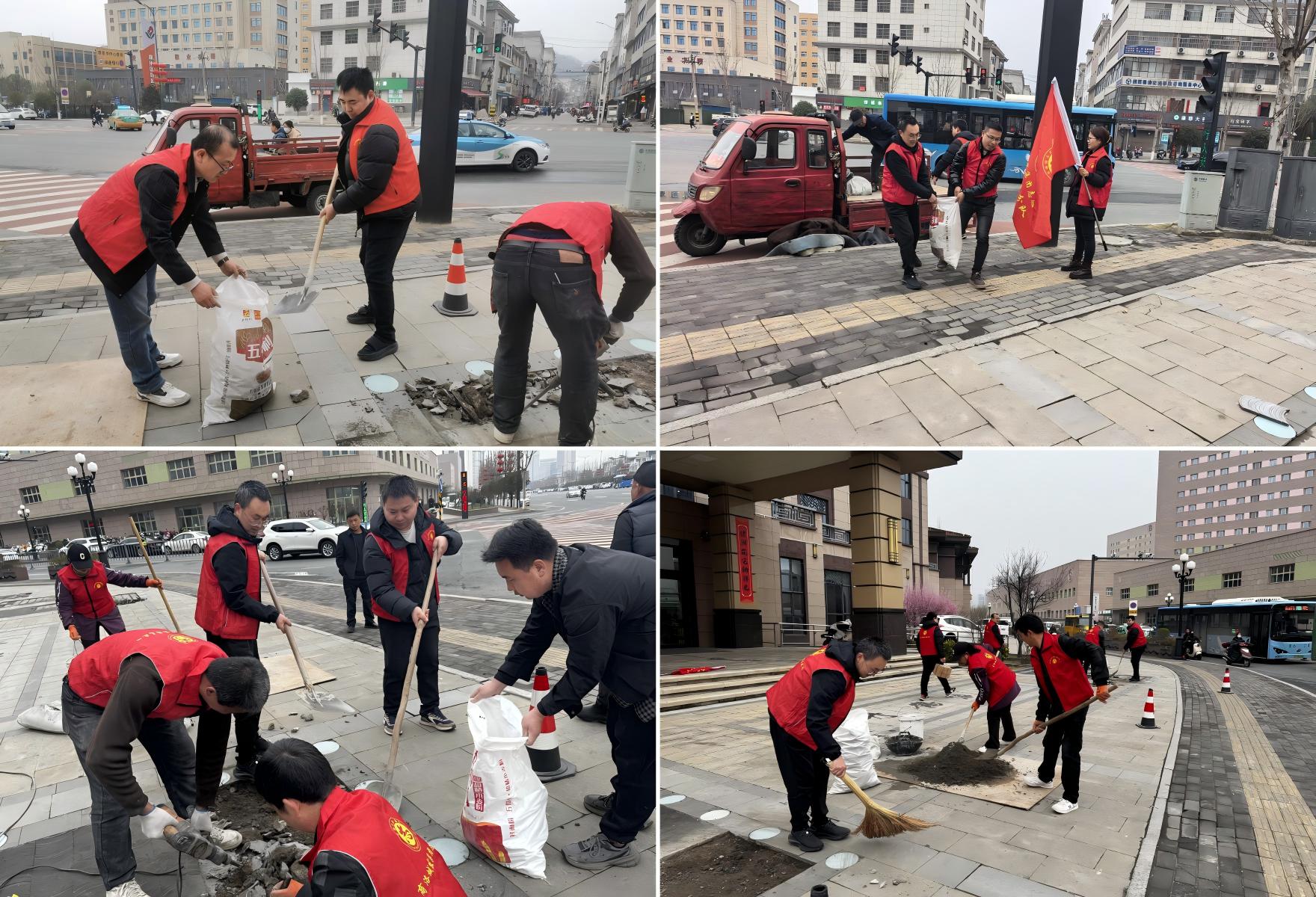 活動現(xiàn)場,志愿者們嚴格遵守活動要求,統(tǒng)一身著志愿馬甲、手持志愿旗幟,分組協(xié)作、相互配合,有序完成材料轉運、水泥砂漿倒運、建筑垃圾清掃等工作。施工師傅嚴格把控質(zhì)量與安全,先對破損路面進行清理、切割,再采用水泥砂漿對破損路面進行填充、平整,最后對破損的行道磚逐一重新鋪設、加固。經(jīng)過一番忙碌,破損路面被修補完善,丹鶴綠洲小區(qū)周邊環(huán)境煥然一新,切實解決了路面破損帶來的群眾出行困難問題,獲得群眾的一致認可。